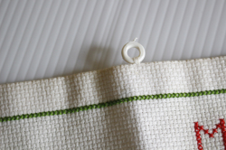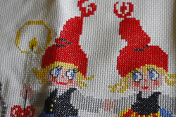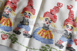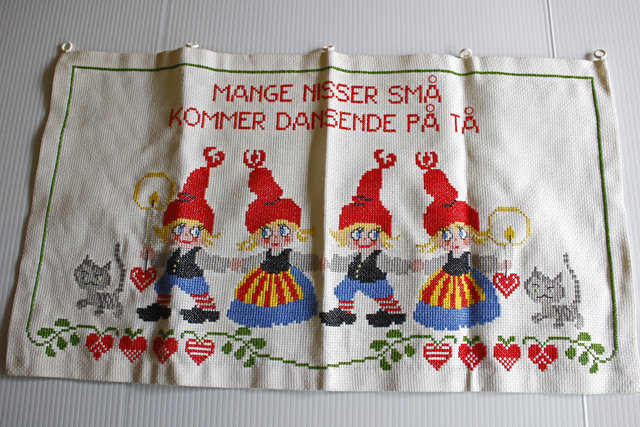 デンマークで見つけた丁寧な手刺繍が施されたヴィンテージの壁掛けです。ざっくりした生地に可愛らしい色合いでスウェーデンのニッセがデザインされています。手を取り合ってクリスマスのダンスを楽しむ姿が微笑ましいです。上部に取り付けフックがついています。
