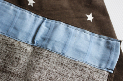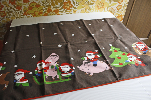 デンマークで見つけたクリスマスのクロスです。こちらはハンドプリントのクリスマスのモチーフでサンタさんとぷっくりしたブタさんとの微笑ましいタッチの絵柄がデザインされています。元々カーテンのような使い方をしていたようで、テーブルクロスとして、またはかごなどの目隠しにも使えますので、多様にお使いください。