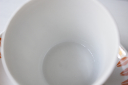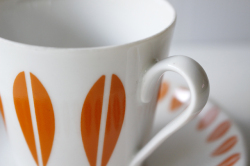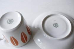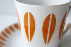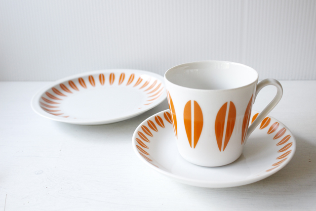1936年~1969年という短い間しか存在しなかった、デンマークのLyngby Porcelain(リュンビュー・ポーセリン)のロータス柄のカップ&ソーサーです。こちらは、ノルウェーのキャサリンホルム社の協力で製作されたものです。オレンジのビタミンカラーがとてもレトロで愛らしく、飾って楽しみたいほど、カジュアルでポップな雰囲気です。カップ&ソーサーは市場でもなかなか見つからない作品で、当店、初入荷になります!
