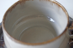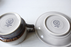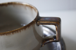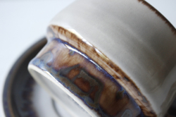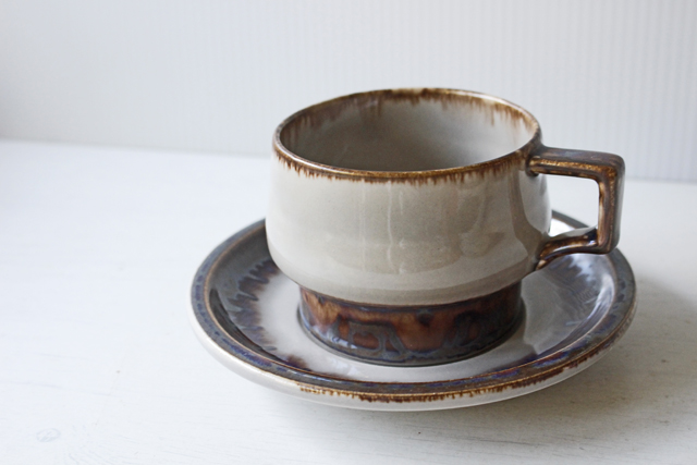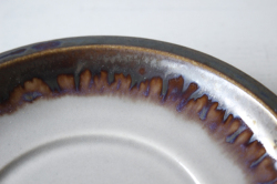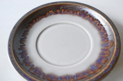 デンマーク、Jens.H.Quistgaard(イェンス・クイストゴー)デザインMexicoシリーズのティーカップ&ソーサーです。タイトルはメキシコ。メキシコのぎらつく太陽を思い浮かべたのでしょうか。釉薬の流れによって出来た自然な景色、ブラウンの下から浮かび上がる紫の幻想的な雰囲気が素敵なお品です。お揃いでティーポット、クリーマーなどもあります。
