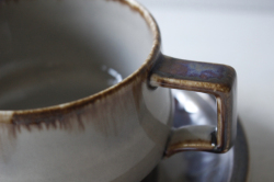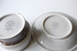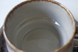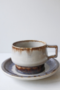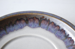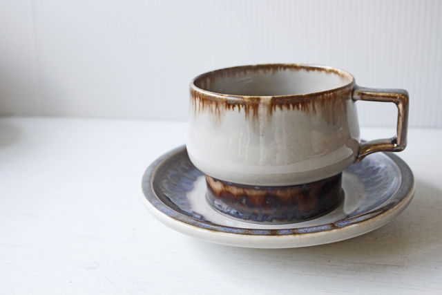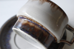 デンマーク、Jens.H.Quistgaard(イェンス・クイストゴー)デザインMexicoシリーズのティーカップ&ソーサーです。タイトルはメキシコ。メキシコのぎらつく太陽を思い浮かべたのでしょうか。釉薬の流れによって出来た自然な景色、ブラウンの下から浮かび上がる紫の幻想的な雰囲気が素敵なお品です。お揃いでティーポット、クリーマーなどもあります。