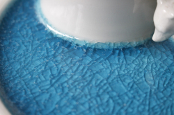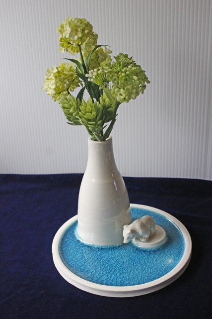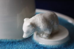 デンマークで見つけた小さな工房で作られたデザインベースです。こちらは底面は鮮やかなブルーカラー、貫入を入れた凝った造りでキラキラとした海のような美しい面に、真っ白な子熊が佇んでいます。その横に真っ白の花瓶がデザインされており、一輪挿しのお花を生けるととても華やかになります。売主さんによると、コペンハーゲンにある“Designers Zoo”という雑誌やメディアでも人気のセレクトショップで20年ほど前に購入したそうです。Designers Zooはデザイナーや職人さんが手掛けた多量生産されていない素敵な作品に出会える素敵なアトリエでとても人気があります。お気に入りのスペースにお花やキャンディなど、また時計やアクセサリー置きなどアイデア次第でデコレーションしてお楽しみくださいね。