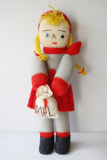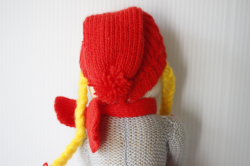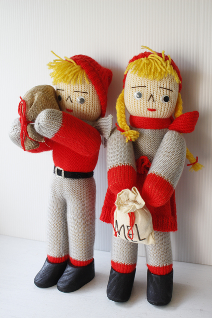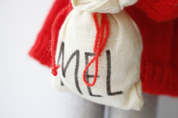 デンマークで見つけたニッセの女の子です。こちらは、手編みのハンドメイドで編まれたシュールな表情のユニークなお人形で、Mel(小麦粉)と書かれた袋を持っています。ジンジャークッキーなどクリスマスのお料理の準備をしている様子を表現してるようです。デコレーションとして飾ると可愛らしくてお勧めです。