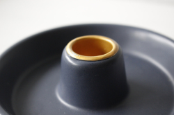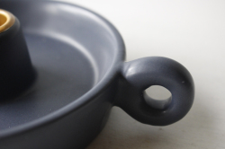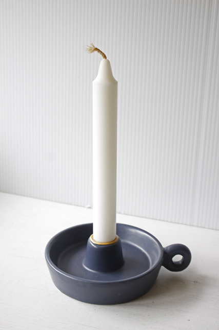 デンマークで見つけた陶器のキャンドルホルダーです。どっしりしたタイプで、安定感があります。持ち手のあるクラッシックなデザインで受け皿部分が大きく、マッチや火消を置いたり、デコレーションしてみたりして楽しんでください。シックなネイビーカラーが素敵です。