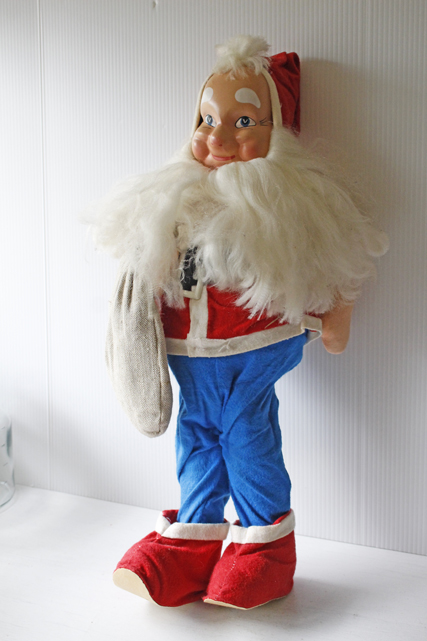 デンマークで見つけたサンタクロースです。こちらは、レアな1950年代のお人形でお顔はつるんとした素材、体は布でしっかりとした造りです。クリスマスツリーの下や横などに飾っていただくと存在感もあり、おすすめです。お店やカフェなどのデコレーションにもピッタリです。