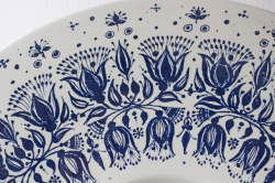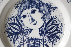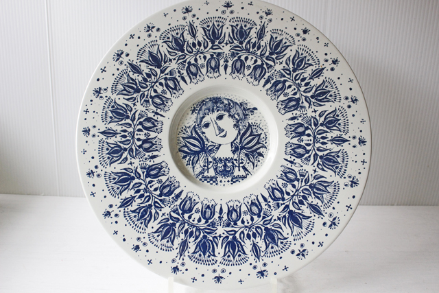 デンマークの人気デザイナーBjorn Wiinblad(ヴョルン・ウィンブラッド)の美しい絵皿です。女性が両手にお花を持って微笑んでいます。単色ながら、ヴィンブラッドならではの華やかさがあります。Φ30センチの大きなサイズで、存在感がありインテリアの主役となるような迫力があります。壁に飾れるようにヒモを通す穴が開いています。