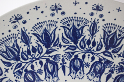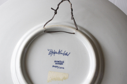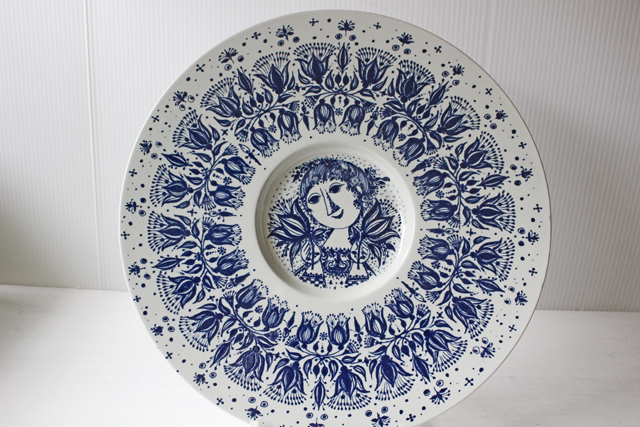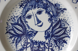 デンマークの人気デザイナーBjorn Wiinblad(ヴョルン・ウィンブラッド)の美しい絵皿です。女性が両手にお花を持って微笑んでいます。単色ながら、ヴィンブラッドならではの華やかさがあります。Φ30センチの大きなサイズで、存在感がありインテリアの主役となるような迫力があります。壁に飾れるようにヒモを通す穴が開いています。
