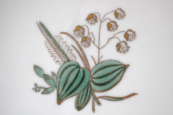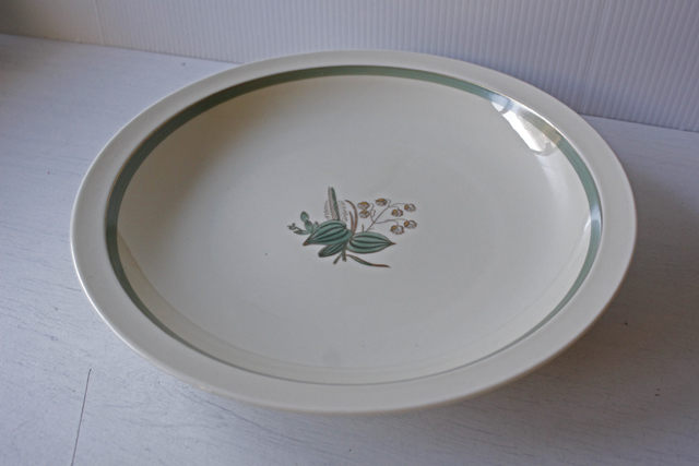デンマーク、Royal Copenhagenの深皿です。地色はアイボリーで、金彩、アクセントにモスグリーンのラインが入ったクラシックな雰囲気です。Quaking grassは日本では小判草と言う名でふんわり、ふっくらとした可憐なお花です。1950年代に製作されていますので今の時代にない、ノスタルジックなオールド感が味わってもらえそうです。こちらは大きめ×深みがありますので大盛りのお料理をサービングしたり、果物などを盛り付けてテーブルの上においてもエレガントで素敵です。