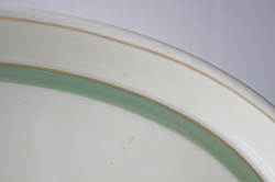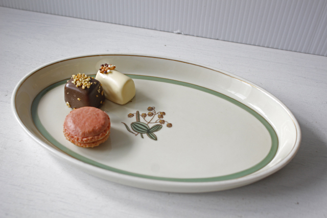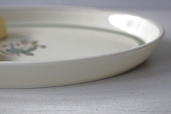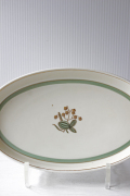 デンマーク、Royal Copenhagenのオーバルプレートです。地色はアイボリーで、金彩、アクセントにモスグリーンのラインが入ったクラシックな雰囲気です。Quaking grassは日本では小判草と言う名でふんわり、ふっくらとした可憐なお花です。1950年代に製作されていますので今の時代にない、ノスタルジックなオールド感が味わってもらえそうです。ちょっとしたティータイムにお菓子などのせて楽しんでください。