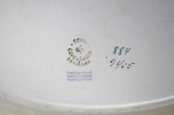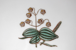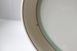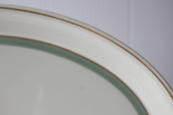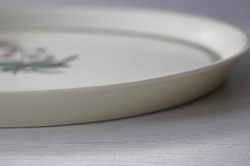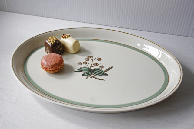 デンマーク、Royal Copenhagenのオーバルプレートです。地色はアイボリーで、金彩、アクセントにモスグリーンのラインが入ったクラシックな雰囲気です。Quaking grassは日本では小判草と言う名でふんわり、ふっくらとした可憐なお花です。1950年代に製作されていますので今の時代にない、ノスタルジックなオールド感が味わってもらえそうです。ちょっとしたティータイムにお菓子などのせて楽しんでください。