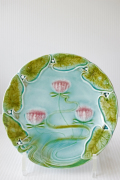 ドイツのビレロイボッホ社のデザインプレートです。こちらはターコイズブルーと蓮の花のピンク、葉っぱのグリーンのコンビネーション、葉っぱのモチーフがリムの部分にグルリとデザインされており、大変美しいデザインのプレートです。刻印から1883-1912年に作られた作品でアンティークらしい雰囲気がお部屋をエレガントに彩ってくれそうです。市場でもあまり見かけない珍しい作品ですので、コレクションにも大変おすすめです。