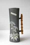 デンマークで見つけた小さな工房で作られた花瓶です。こちらは黒地のモノトーンなフォルムに持ち手がバンブー、真ん中にはハンドペイントでお花が描かれており、ほっこりとしたデザインです。ハンドメイドやほっこりとしたレトロ雑貨がお好きな方にお勧めしたい作品です。