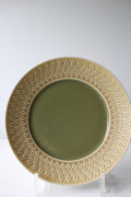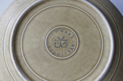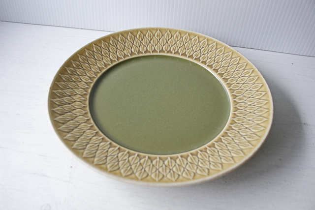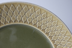デンマーク、イェンス・クイストゴー(Jens.H.Quistgaard)デザインreliefシリーズのデザートプレートです。葉っぱの形をモチーフにした絵柄が素敵なrelief(レリーフ)シリーズの中でも中央部に深いグリーンの釉薬がかけられた珍しいものです。気品のある雰囲気で食卓も優雅になりそうです。手作りなので1点、1点、釉薬のかかり具合などが異なり、色の濃さも違っております。ヴィンテージならではの味わいをお楽しみ下さい。こちらのシリーズは、当時人気を博したため長年にわたって製作されました。そのため、刻印も時代によって異なっています。