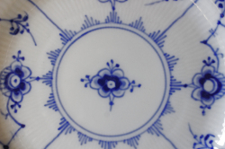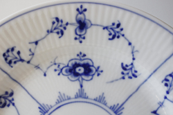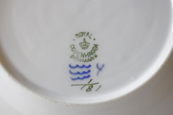 デンマーク、Royal Copenhagenのケーキプレートです。こちらは日本でも人気のある、ブルーフルーテッドシリーズのヴィンテージ品になります。こちらはプレーン。プレート全面に可憐なハンドペイントで描かれた可憐な図柄に、ホワイト×ブルーという色合わせの清々しさは、いつの時代も乙女心をくすぐります。職人さんが丹精込めて描いた作品は一つ一つ個性的でロイヤルコペンハーゲンのアイコン的デザインでもあり、古さを感じさせないデザインは現地デンマークでも若い人からお年寄りまで世代を超えて愛されており、食卓を彩っています。現行品の生産はタイに移っています。今回入荷分は時代が古く、絵付師さんのサインがアルファベットではなく数字(初期の絵付師さんは個々に番号が与えられていました)になっていることもロイコペファンには見逃せないポイントです。