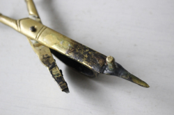 デンマークで見つけた真鍮のろうそくの芯取りです。ろうそくを吹き消すだけでは、芯が残り、黒いモクモクとした煙が出ることもあり、こちらの芯取りで、焦げたススをすくうように当てると、芯取りの受け皿にススがパラパラっと取り除くことができ、大変実用的です。オブジェとして飾って頂いても、落ち着いたアンティークのインテリアを演出できそうです。