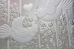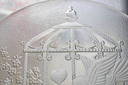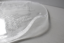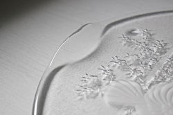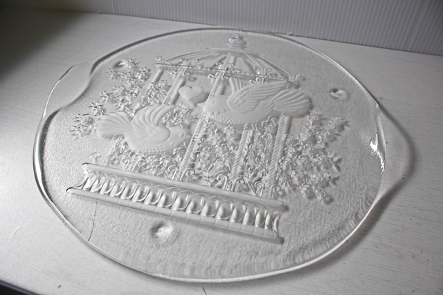 デンマークで見つけたヴィンテージのガラスのプレートです。こちらはΦ32cm と大きめのプレートで可愛らしい2羽の小鳥がモチーフで、背景には素敵な鳥かご、フラワー、ハートとハッピーでほっこりとするデザイン。大きめですので、大盛りでサラダやカナッペ、おさしみなどを出しても華やかで素敵です。