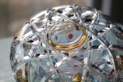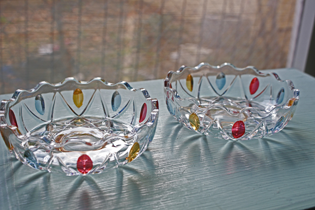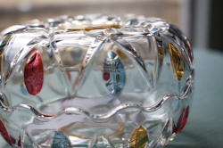 デンマークで見つけたガラスのボンボニエールです。こちらはクリアカラーに赤、青、黄色のドロップのようなモチーフがデザインされており、カッティングが施してあるので、キラキラして華やかさもあります。食卓で、またサイドボードに置いてアクセサリーを飾りながら乗せたりと多様にお使い頂けそうです。2つの小皿やボウルとしてもお使い頂けそうです。