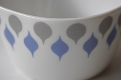 1936年~1969年という短い間しか存在しなかった、デンマークのLyngby Porcelain(リュンビュー・ポーセリン)のボウルです。こちらはDanlidシリーズでリュンビュー社の大ヒットシリーズでもあります。可愛らしい雨粒のようなドロップ模様が幾何学模様的に配列されています。ブルーとグレーのコンビネーションが大変おしゃれで食事が楽しくなりそうな使い勝手の良いボウルです。