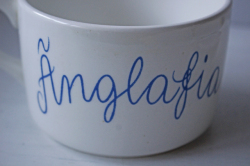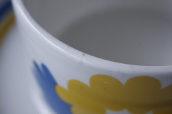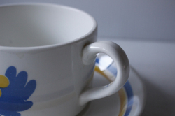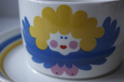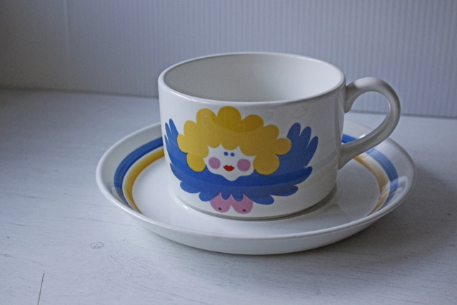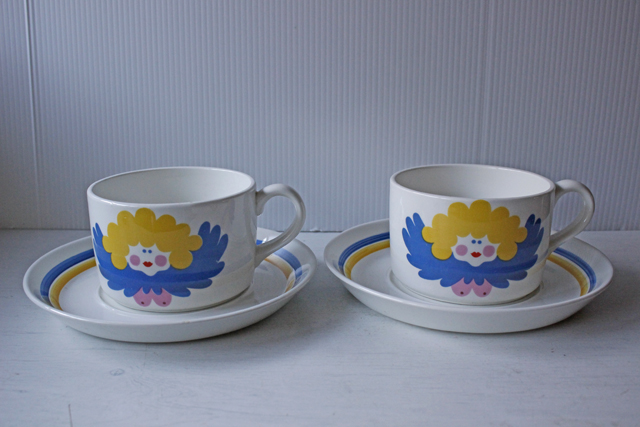 スウェーデン、GUSTAVSBERG(グスタフスベリ)のAnglafiaシリーズのカップ&ソーサーです。エンジェル(天使)のモチーフですが、こちらの天使は子供の可愛い天使モチーフではなく、豪快なおばちゃま天使のようなユニークなデザインで、クスっと笑えるシリーズ。サイズも大きめで、ソーサーをセットにして並べると迫力もあり、たっぷりのお茶、コーヒーを楽しめそうです。容量は上部ギリギリまで入れると400mlです。こちらのシリーズは、市場でも珍しくコレクションにもおススメです。