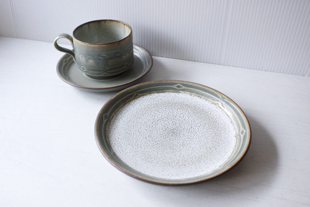 デンマーク、Jens.H.Quistgaard(イェンス・クイストゴー)デザインRUNEシリーズのケーキプレートです。RUNEとは、「ルーン文字」という意味で、8世紀頃から北欧を中心に占いなどに使用され始めた文字のことです。デザインされているダイヤ模様は、ルーン文字の「イング」を表しているようで多産(生命力)と豊穣、また幸運などの意味があるようです。落ち着いたマットなグリーンが魅力的です。