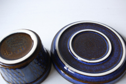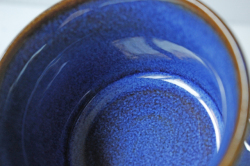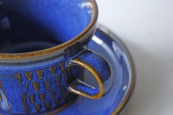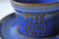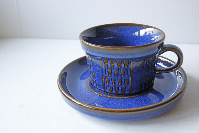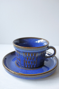 デンマークの小さな島(ボーホルム島)に1835年から1996年まで存在した陶器メーカーSoholm(スーホルム)の青のカップ&ソーサーです。ぽってりとした厚みのあるフォルム、深いマリンブルーにブラウンが浮かび上がってとても美しいです。