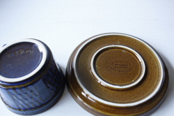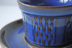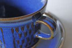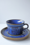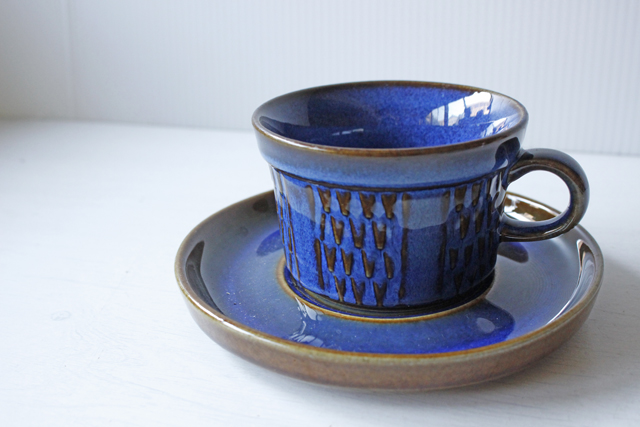 デンマークの小さな島(ボーホルム島)に1835年から1996年まで存在した陶器メーカーSoholm(スーホルム)の青のカップ&ソーサーです。ぽってりとした厚みのあるフォルム、深いマリンブルーにブラウンが浮かび上がってとても美しいです。