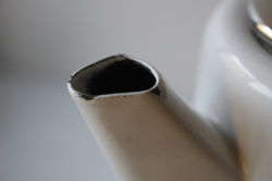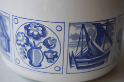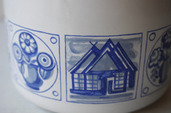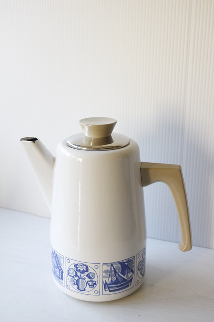 デンマークで見つけたヴィンテージのホーローポットです。こちらはホワイト地にコバルトブルーで描かれたフラワーやお家などのモチーフがデザインされています。組み合わせが北欧らしい色合いで、ヴィンテージのポットらしいフォルムが実用だけでなく、キッチンのオブジェとして楽しんで頂けそうです。