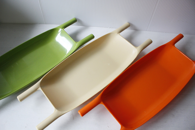 デンマーク製のヴィンテージトレイです。舟形のユニークなフォルムにプラスティックのポップな雰囲気がカジュアルな食卓を演出できるでしょう。