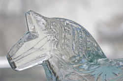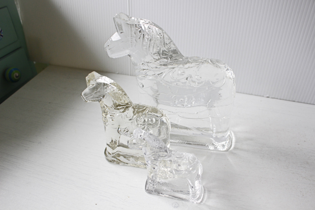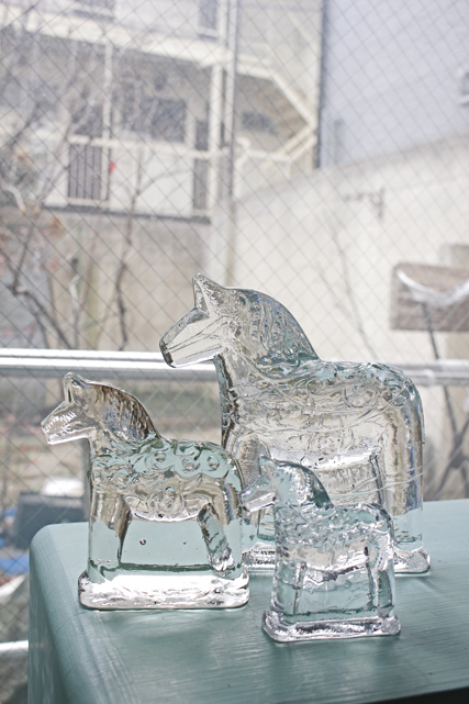 スウェーデン製ヴィンテージガラスのオブジェです。こちらはダーラヘスト(スウェーデン語でダーラナ馬という意味)は、18世紀の始め頃、木こりの人たちが 仕事が終わった後に遊び半分に作った木彫りの馬が始まりといわれています。スウェーデンのアイコン的なフォルムの馬が、ガラス製のオブジェとして作られました。クリアカラーのキラキラと反射する素材は窓辺や灯りの近くに飾ることで、とてもヒュグリな気分にさせてくれます。3体同時入荷していますが、中サイズのみ少し色味が違います。
