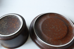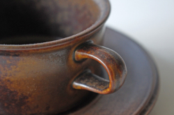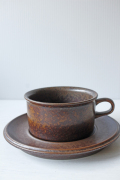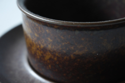 フィンランド、ARABIAのデザイナーUlla Procope(ウラ・プロコッペ)デザイン、Ruskaシリーズのカップ&ソーサーです。備前焼きに通じるような渋いデザインです。ひとつひとつ微妙に異なる釉薬の趣が魅力です。フォルムは「Kosmos」と同じです。濃い目に入れたコーヒーが似合いそうです。個々に個性がありますのでお気に入りを見つけてください。