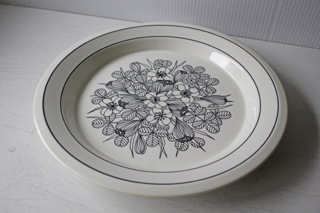 フィンランド、ARABIA/Esteri Tomula/エステリ・トムラのデザインした、クロッカスシリーズのディナープレートです。エステリ・トムラは、1947年~1984年まで長きにわたりアラビアで活躍した装飾デザイナーです。北欧の春を待ちわびるクロッカスが見事な線描で表現されています。あえてお色を使わず、大人っぽい仕上がりとなっています。製造期間が2年と短かったため、市場でも見つけるのが困難なお品です。お探しの方は、お見逃しなく。こちらは26cmと大きめですので、たっぷりとお料理などをもてなせそうです。