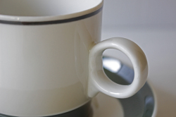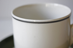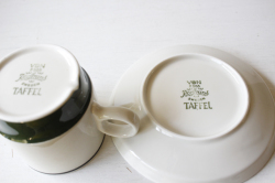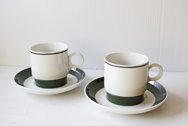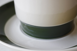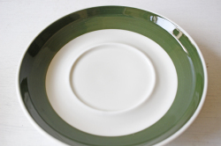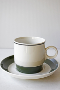 スウェーデン、Rorstrand(ロールストランド)のカップ&ソーサーです。こちらは、Taffelシリーズで淵周りには落ち着いたダークグリーンがぐるりとライン付けされており、シンプルな中にもこだわりのある素敵なデザインです。すっきりとしたフォルム、ソーサーは淵の部分が高めになっており、デザイナーのこだわりが感じられます。何より、この美しいグリーンの色合いがおススメの作品です。