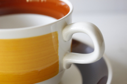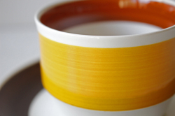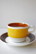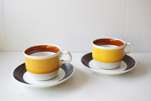 スウェーデン、Rorstrand(ロールストランド)のFokus(フォーカス)シリーズのコーヒーカップ&ソーサーです。黄色とブラウンのコンビネーションが大変可愛らしいデザインです。チョコブラウン、ライトブラウン、イエロー3色の明るく温かな色合いでシーズンを問わずお使いいただけますね。フリーハンドで彩色されているため、刷毛の流れが個々に違いハンドペイントの醍醐味を味わえます。コーヒータイムにぴったりなオススメの作品です。
