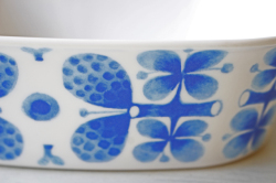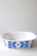 スウェーデン、グスタフスベリ社、Bluesシリーズのヴィンテージスクエアボウルです。こちらは同社の看板デザイナー、リンドベリが手掛けており、鮮やかで美しいフラワーモチーフとコバルトカラーが特徴で、当時、とても評価の高かった作品になります。10年ほど前に復刻版として、スウェーデンのOpto design/オプトデザイン社から発売されましたが、こちらはグスタフスベリの刻印の入った1960年代のオリジナル品で、市場にもあまり出ていない作品になります。厚みのあるしっかりとした造りで、同じサイズのプレートを合わせると蓋つきになり、スタッキングも出来るなど大変機能的に作られています。