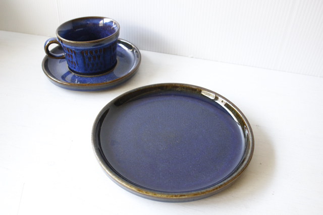 デンマーク、Soholm(スーホルム)のケーキプレートです。こちらは、スーホルム社でもっとも有名になった青のシリーズで、ぽってりとした厚みのあるフォルム、ブラウンににブルーが流し込まれたような複雑なお色が浮かび上がってとても美しいです。手作り品のため、釉薬のかかり方に個性があります。カトラリーキズなどコンディションの良いものが見つかりにくいシリーズです。
