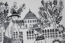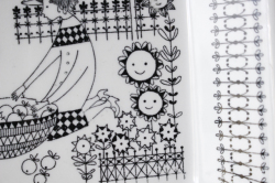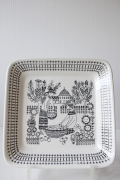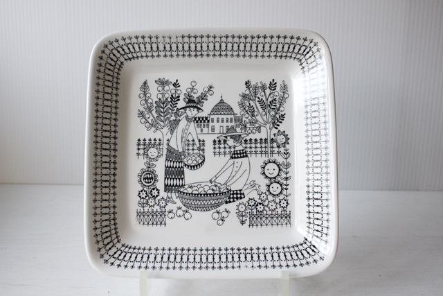 フィンランド、ARABIA/Raija Uosikkinen(ライヤ・ウオシッキネン)のデザインした、エミリアシリーズのスクエアプレートです。こちらは2人の女性がリンゴの収穫をしているモチーフです。周りに咲いているお花にも表情が描かれているのが、可愛らしくコレクターも多いシリーズになります。