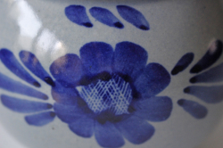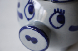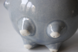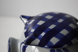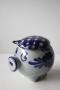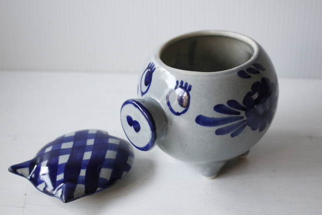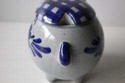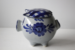 デンマーク、Aksini社のマーマレードポットです。愛嬌のあるベレー帽を被ったブタさんのがモチーフになっています。ハンドペイントでお花などが描かれておりヴィンテージらしいレトロな味わいがあります。手作りジャムなどだけでなく、シュガーポットとして使っても素敵です。かわいらしいフォルムですので、キッチンなどでは棚の中でなく、是非飾って収納していただきたいです。