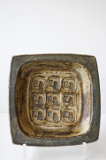 Royal Copenhagen(ロイヤルコペンハーゲン)/Jorgen Mogensenデザインの角皿です。スクエア型のどっしりとした角皿には立体感のある幾何学模様がデザインされ、バッカシリーズとは趣の違う重厚な雰囲気のデザインです。日本の和室や和菓子にも、マッチするモダンテイストで時を経たデザインが斬新でオブジェとして飾っていただくのも素敵です。