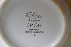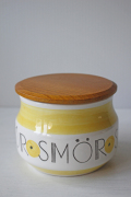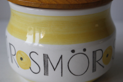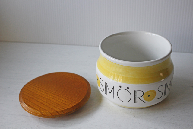スウェーデン、Rorstrand(ロールストランド)の蓋つきポットです。こちらは丸っこいフォルム、イエローカラーのポップなデザインで、スウェーデン語でSmor、バターと書かれています。木製のナチュラルな蓋つきですので、キャンディなどを入れても良さそうです。市場でもなかなか見かけない珍しい作品でおススメです。