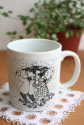 デンマークの人気デザイナーBjorn Wiinblad(ヴョルン・ウィンブラッド)のマンスリーマグカップです。こちらのシリーズは1月から12月までの1枚1枚に男女の出会い、結婚、妊娠、出産までを四季を交えながら描いています。4月のテーマは「KONFLIKT」(争いごと)。どんなに仲の良いカップルでもケンカはするもの。相合傘の中の2人はそっぽを向いています。早く仲直りできるといいですね。