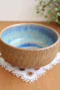 デンマーク、Michael Andersen & Son社の花瓶です。側面は素焼きにシンプルな葉っぱ模様がデザインされています。内側にはペールブルーの柔らかなお色の釉薬がたっぷりと流し込まれていて対比がとても美しい作品となっています。深鉢なので、煮物や和え物を盛り付けてもよいでしょう。