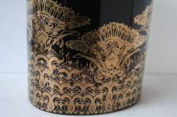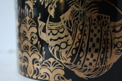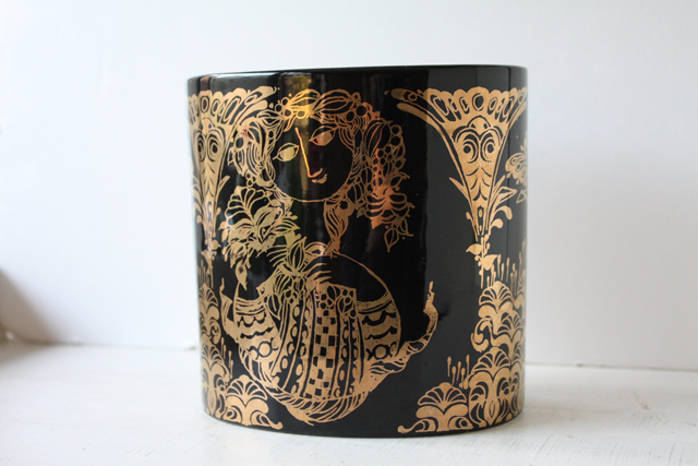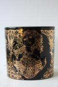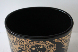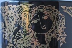 デンマークで人気のアーティスト/Bjorn Wiinblad(ヴョルン・ウィンブラッド)のフラワーベースです。こちらは珍しい漆黒でツヤのある釉薬がたっぷりかけられ、金彩でヴィヨルン独特の美しい女性がデザインされています。ブラック×ゴールドという華やかな雰囲気で、お部屋のインテリアを素敵に彩ってくれるでしょう。