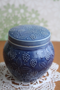 ARABIA/Ulla Procope(ウラ・プロコッペ)デザインのジャムポットです。こちらはフィンランドのお菓子メーカーCHYMOSがアラビアに依頼して注文生産したものです。キャンディなどを入れて販売するためのものだったのでしょう。ベリーがブルーの釉薬の中から浮かび上がり、繊細でとても愛らしい雰囲気です。