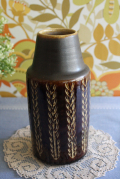デンマークの小さな島(ボーンホルム島)に1835年から1996年まで存在した名窯Soholm(スーホルム)のフラワーベースです。柔らかな曲線のフォルム、落ち着いたブラウンに植物がデザインされています。ツヤノある釉薬のかけられた側面と、上部のマットな質感との対比が美しい佇まいです。