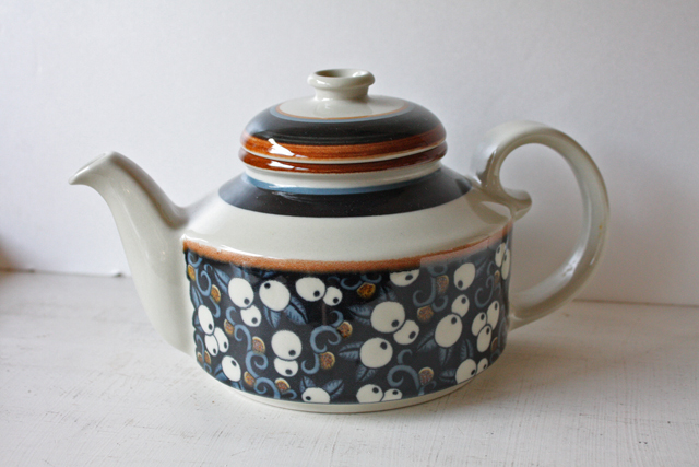 フィンランド、ARABIA/Taikaシリーズのティーポットです。デザインは、アラビアに夫婦で在籍していたPeter Winquist(ペテル・ウィンクヴィスト)とその妻、Anja Jaatinen-Winquist (アンヤ・ヤーティネン・ウィンクヴィスト)が共同でデザインしたものです。黒に近いようなダークブルーに白いベリーが描かれた大人の可愛らしさを感じる作品です。今回入荷分は、使用感少なく内側もピカピカでおススメです。