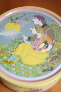 デンマークの国民的人気アーティストBjorn Wiinblad(ヴィヨルン・ウィンブラッド)デザインのヴィンテージ缶です。クッキー缶のようなフォルムで大きめです。4種類の図柄が出されたうちの一つです。他の図柄は側面に載っています。
