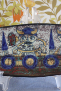 デンマークのMichael Andersen & Son社の飾り皿です。デザインは数々の女性らしい柔らかな作品を生み出したMarianne starckになります。こちらの作品は、北欧ならではのバイキングがモチーフで、船に乗り込みラッパで号令の合図を送る乗組員がデザインされています。こちらはドイツ/ブリュッセルの世界万博で金賞を受賞したPersia Techniqueと呼ばれる貫入による独特の技法が使われています。モザイク画のような味わいがあります。