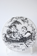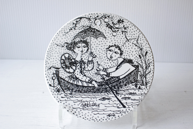 デンマークの人気デザイナーBjorn Wiinblad(ヴョルン・ウィンブラッド)の美しい絵皿です。こちらのシリーズは1月から12月までの1枚1枚に男女の出会い、結婚、妊娠、出産までを四季を交えながら描いています。7月のテーマは、「NOCTURNE(夜想曲)」。北欧の夏は白夜です。2人は白夜の夜をボートに乗って楽しんでいるのでしょう。