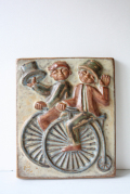 デンマークのMichael Andersen & Son社の陶板の壁掛けです。クラシックな自転車に乗った紳士が2人デザインされています。一人はシルクハットを持ち上げてにこやかに挨拶しています。デザイナーは、Marianne Starckで落ち着いた味わい深い色彩の作品を得意としています。こちらは、壁にかける穴は開いていないのですが、フックに引っ掛けたり、立てかけて飾ったりどちらでも大丈夫なつくりとなっています。