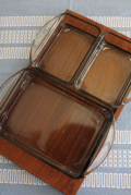 デンマークで見つけた木製のトレイとガラス容器のセットです。ディップを入れたり、オリーブやピクルスを入れても素敵です。手巻き寿司の具材をのせてもよいですね。